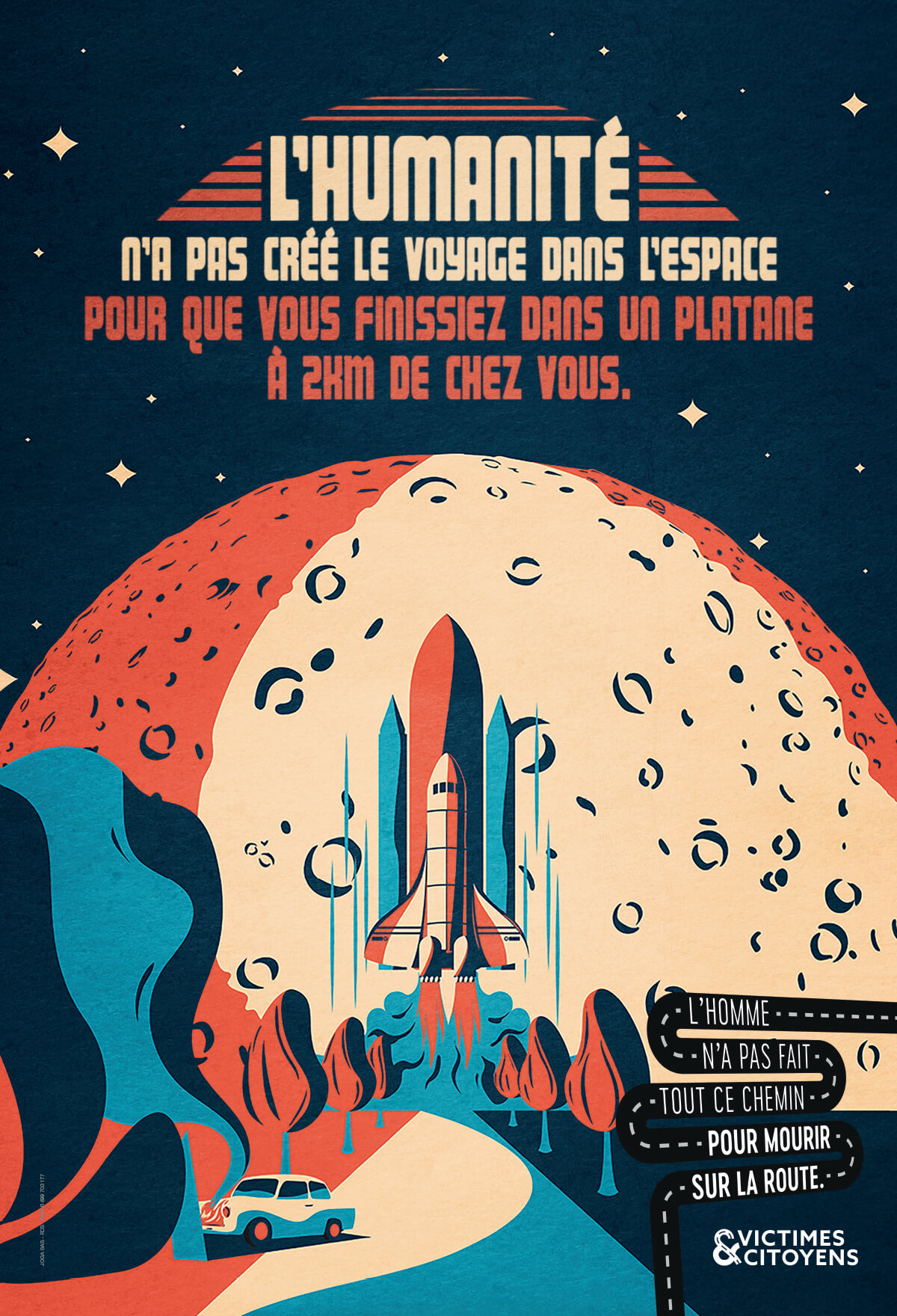 Pour renouveler le discours sur les dangers de la conduite, nous avons choisi de prendre de la hauteur et d’inviter à la réflexion, en mettant en perspective les extraordinaires avancées de l’humanité face à l’inutilité d’une vie perdue au volant. Si l’Homme a inventé le voyage dans l’espace, le système monétaire, et augmenté son espérance de vie, ce n’est certainement pas pour mourir sur la route.
